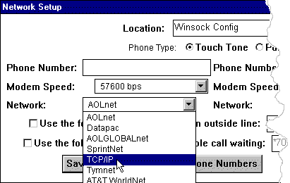 Figure 3: Network Setup Window - Changing network type to TCP/IP America Online 2.5 or 3.0 is now ready to be accessed through an active Internet connection.